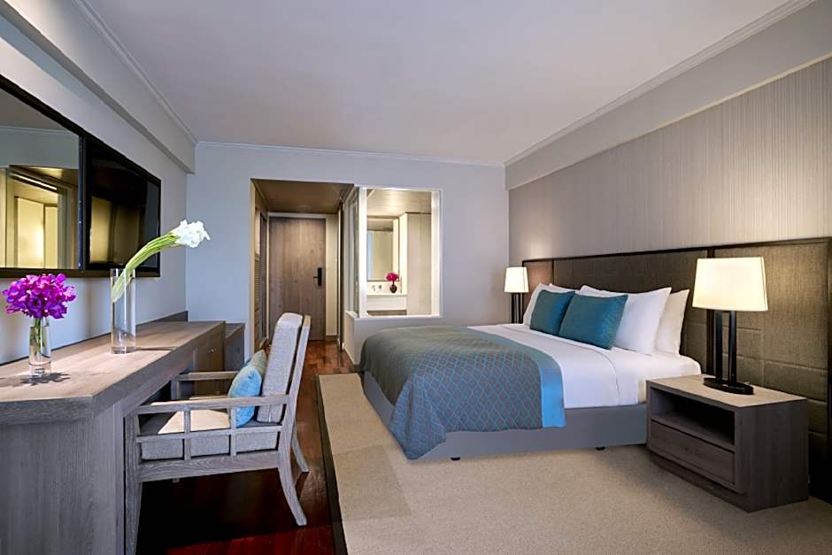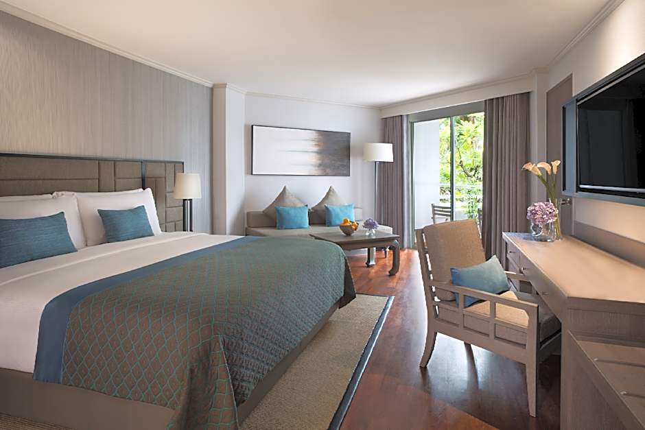 Deluxe Garden View Room is 409 square feet and includes either a king-size bed 150-183 width or 2 single beds 80-130 width plus balcony, extra beds on demand, desk, cable tv, hairdryer, ironing set, safe, bathrobes, and slippers and is Wheelchair-accessible.